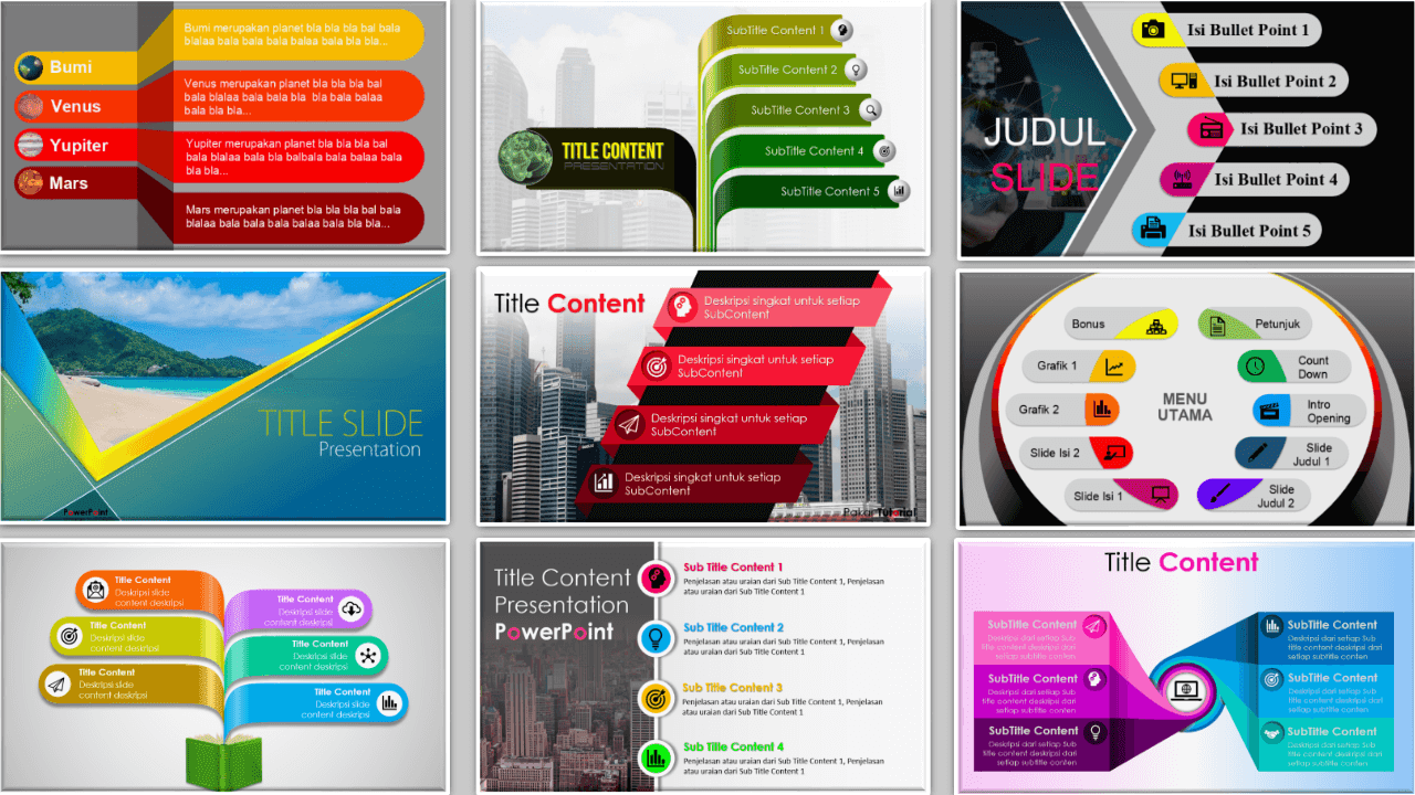 • Isi: Bagian ini adalah inti dari presentasi Anda. Sajikan informasi Anda secara terstruktur dan logis. Gunakan poin-poin utama, contoh, dan data pendukung untuk memperkuat argumen Anda.
