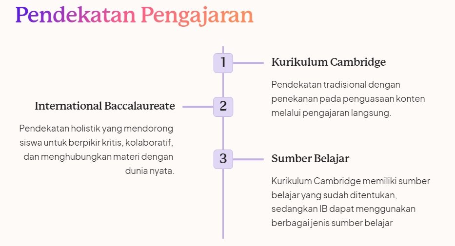 - Reputasi Sekolah: Lakukan riset tentang sekolah-sekolah yang menawarkan program IB atau Cambridge di daerah Anda. Pertimbangkan reputasi akademik sekolah, kualitas guru, dan fasilitas yang tersedia.